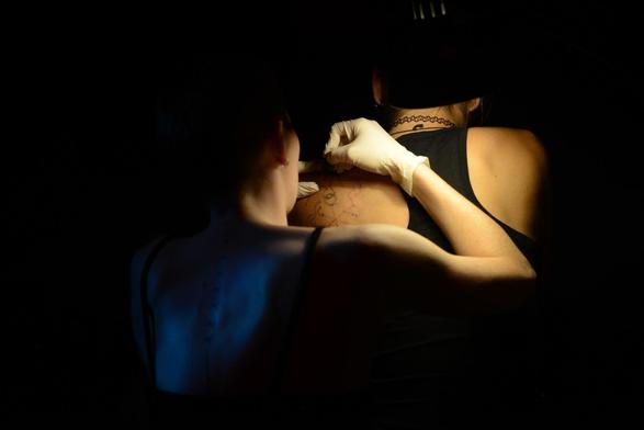 Das älteste Tattoo der Welt ist 3300 Jahre alt. Ötzi der Eismensch hatte 61 Tattoos auf seinem Körper. Die Tattoos wurden gestochen und geritzt, wahrscheinlich mit Knochen- oder Feuersteinnadeln. Wie alt diese Tradition wirklich ist, wiseen wir noch nicht. Vielleicht verändern die Menschen ihre Körper schon bevor sie wussten, Menschen zu sein. Technologien, die wir heute nutzen: Elektrizität, Plastik, Alkohol, synthetische Farbe, Feuerstein, Metall, Papier, Sprache, Kunst. Die Zeit nimmt meine Hand und taucht sie in den Ruß. Shana, FGZ, LJA.