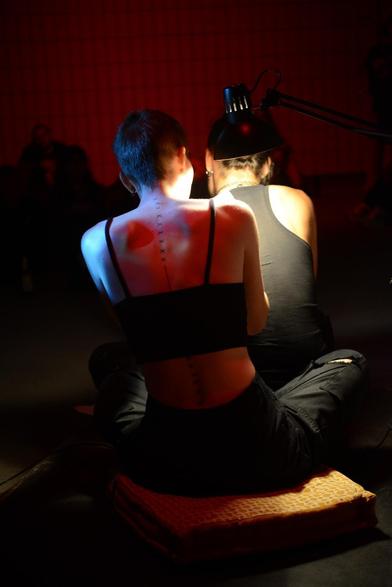 Die Zeit nimmt meine Hand und taucht sie in den Ruß war eine Tattoo- und Lyrikperformance bei dem ersten cyborx.festival des Cyborxxx Kollektivs im August 2025. Die Idee war es, die steinzeitlichen Techniken zum verändern unserer Körper erlebbar zu machen und in Diskurse über Cyborgs, Transhumanismus, und Post(oder Prä-?)humanismus einzubinden.